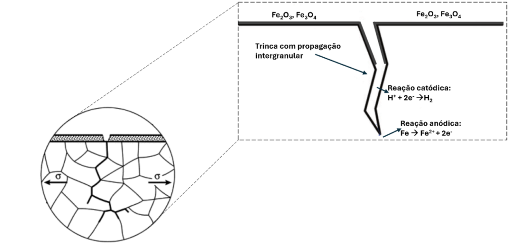 Dessa forma, a ocorrência dessas reações em regiões de concentração de tensão, como soldas e entalhes, leva ao desenvolvimento de trincas de corrosão sob tensão. A propagação dessas trincas no aço carbono tem um caráter intergranular, ou seja, ocorre preferencialmente ao longo dos contornos de grão.