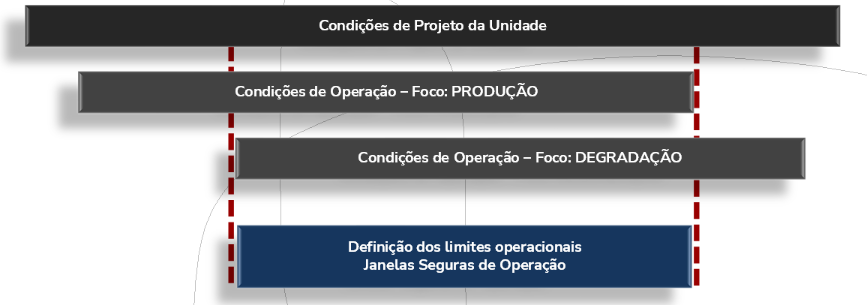 Durante a fase de projeto são definidos os intervalos possíveis de operação de uma unidade industrial. Além disso, há orientações quanto às condições de operação que são focadas na otimização da produção. Assim como, há condições operacionais que podem ser mais críticas para determinado mecanismo de dano. A análise completa da unidade permite definir os limites operacionais que representam as janelas seguras de operação levando em conta o foco na produção e na degradação (API RP 584).